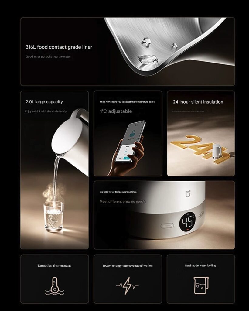 Smart connectivity is a central feature. Users can monitor the water temperature, adjust settings, and manage the device remotely through the Mi Home app. With its 2.0-liter capacity and an 1800W ring heating base, the kettle is both efficient and quick, making it suitable for both homes and offices.